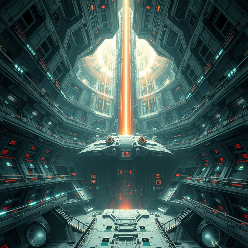 Inside a massive spaceship reminiscent of Tsutomu Nihei's intricate style, akin to the vast interiors of Sidonia no Kishi, underscored by a theme of gigantism. The scene centers around a colossal laser generator, dominating a multi-story space with a sleek, futuristic design. The sci-fi setting is rich in hyper detail, featuring a central laser beam shooting skyward, surrounded by swirling energy clots. This dynamic tableau captures the essence of acceleration and speed, punctuated by intermittent light flashes. The composition is rendered in high-definition, with 8K super-resolution clarity, blending anime and manga graphics for a visually striking image.