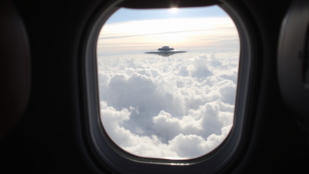 Inside a passenger plane, the view through the seat reveals billowing white clouds outside the window, and just beyond them, a saucer-shaped UFO glides subtly through the sky, casting a faint metallic glint in the sunlight.