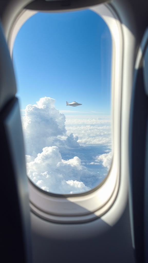 Inside the cabin of a passenger plane, fluffy white clouds drift by under the bright blue sky, as a mysterious UFO hovers in the distance, glimpses of it captured in the window's reflection through the narrow gap between the seats.