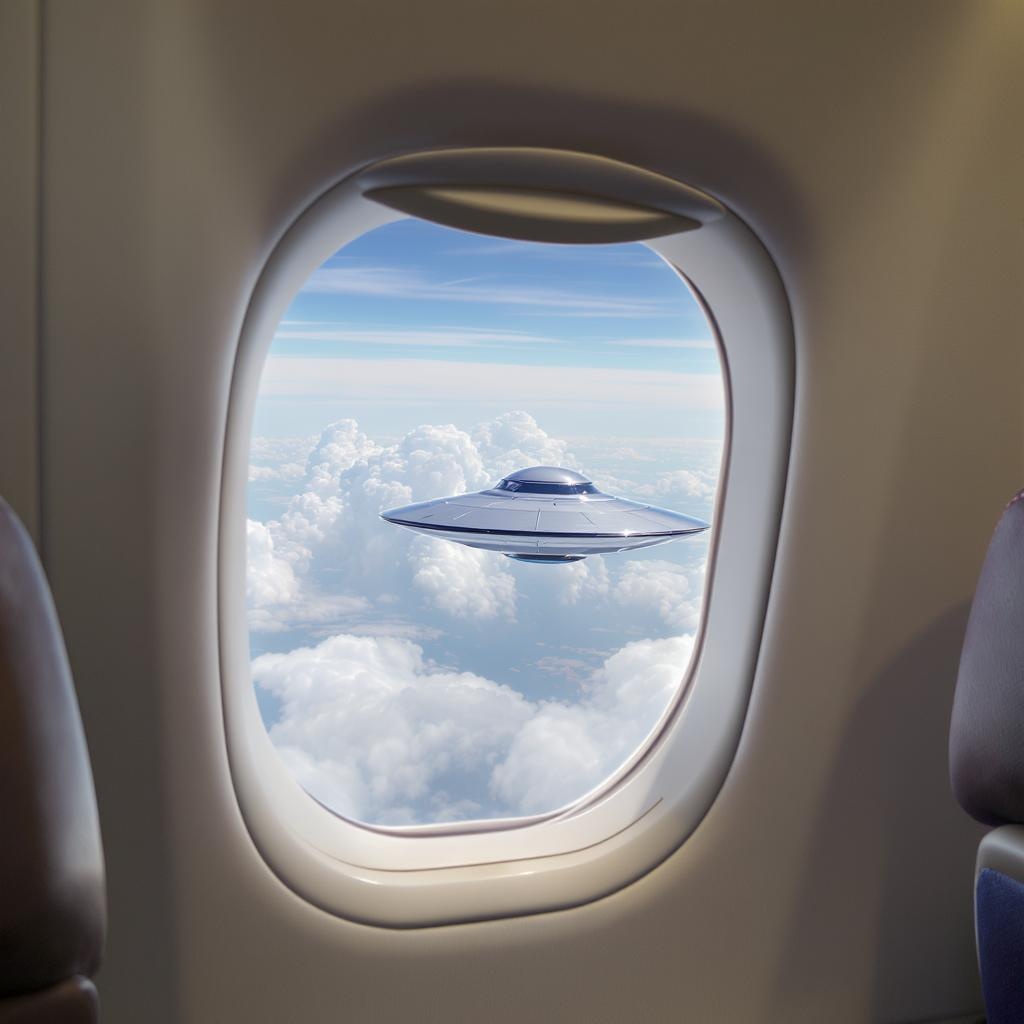 Inside the cabin of a passenger plane, the soft hum of the engines creates a calming atmosphere as fluffy white clouds drift lazily by the window. Through this skyward portal, an unexpected sight captures the imagination—a sleek, metallic UFO gliding gracefully through the azure expanse, its smooth surface reflecting sunlight in a mesmerizing dance of light. Passengers remain oblivious, immersed in their own worlds, while this extraordinary spectacle unfolds silently beyond the confines of the aircraft.