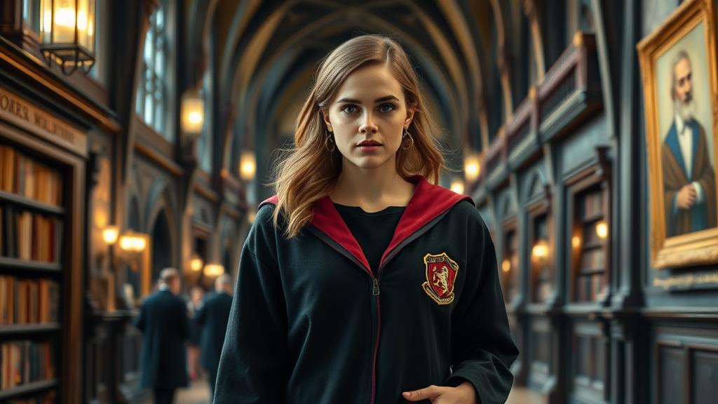 Inside the magical halls of Hogwarts, Emma Watson strides confidently, her Gryffindor school uniform neatly pressed and her eyes filled with curiosity. The familiar scent of old books and flickering candlelight fills the air as she navigates the bustling corridors, the enchanted portraits whispering secrets from the walls. Her robe swishes gently as she moves with purpose, her mind captivated by the wonders of her surroundings. With her wand tucked securely in her pocket, Emma seamlessly blends into the mystical atmosphere, exuding a sense of belonging in this world of enchantment and learning.