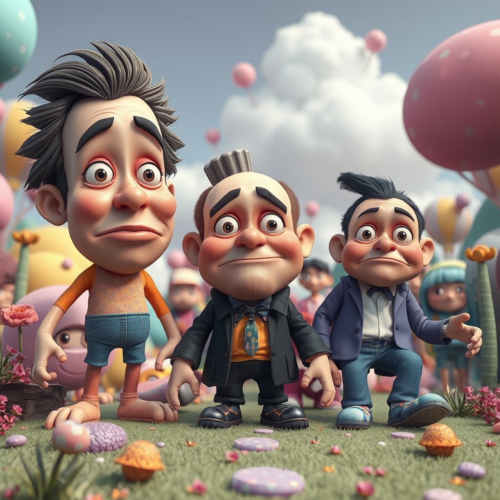 Inspiration from the original prompt led to a unique and imaginative concept: explore a vibrant, semi-abstract world where exaggerated cartoonish figures inhabit a surreal landscape. The characters, with their enormous and whimsically distorted features, embody a playful blend of 3D and CGI, resulting in a visually striking tableau. Their expressions are vivid, and despite the strange proportions, there's a captivating charm to their design. Among the lively scene, unexpected elements like extra limbs and eccentric proportions contribute to a dreamlike quality, transforming what might seem like imperfections into a cohesive and imaginative artistic vision.