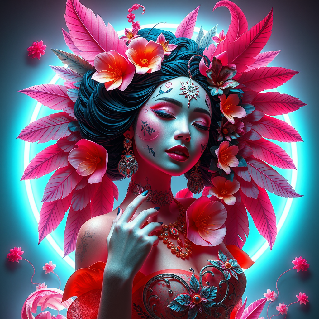 Inspire a digital painting that captures the essence of a voluptuous concubine adorned with feathers and flowers in a paper craft style, drawing from the intricate naturalism of Ernst Haeckel and Maria Sibylla Merian's work. Infuse the piece with the vibrant energy and visual flair akin to the art of Tristan Eaton, Victo Ngai, Artgerm, Rhads, and Ross Draws, with hints of Kaethe Butcher's provocative style and the sleek futurism of Hajime Sorayama. Integrate elements reminiscent of Greg Tocchini's dynamic compositions and the haunting detail found in Virgil Finlay's sci-fi illustrations. Illuminate the scene with neon lights, creating a glowing, otherworldly atmosphere. Aim for an 8k, UHD, HDR digital masterpiece echoing Ilya Kuvshinov’s striking aesthetic seen on platforms like Pixiv. Add subtle nuances that elevate the core concept: vivid colors, intricate details, and surreal transformations. Stay away from technical flaws such as low resolution, blurriness, or unwanted visual distortions.