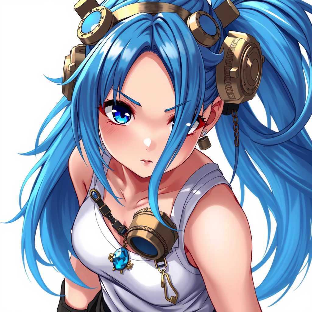 Inspire a vivid image of a young woman with striking ocean-blue hair and piercing sapphire eyes, clad in a white tank top, adorned with intricate steampunk accessories. This character is imagined in an anime style, captured in a dynamic, energetic stance that exudes confidence and flair. The artwork should be rendered in ultra-high detail, with a crisp, clear white backdrop that accentuates her features. The design takes cues from the artistic styles of Hideo Minaba, Yuya Nagai, Ryoji Ohara, Ryota Murayama, and Hitomi Yoshimura, reminiscent of the granblue fantasy aesthetic. Envision her expression as determined, with subtle hints of curiosity, and her attire should reflect a harmonious blend of functional steampunk elements with a touch of fantasy elegance. The overall composition should present a captivating visual narrative, immersing the viewer fully into her world.
