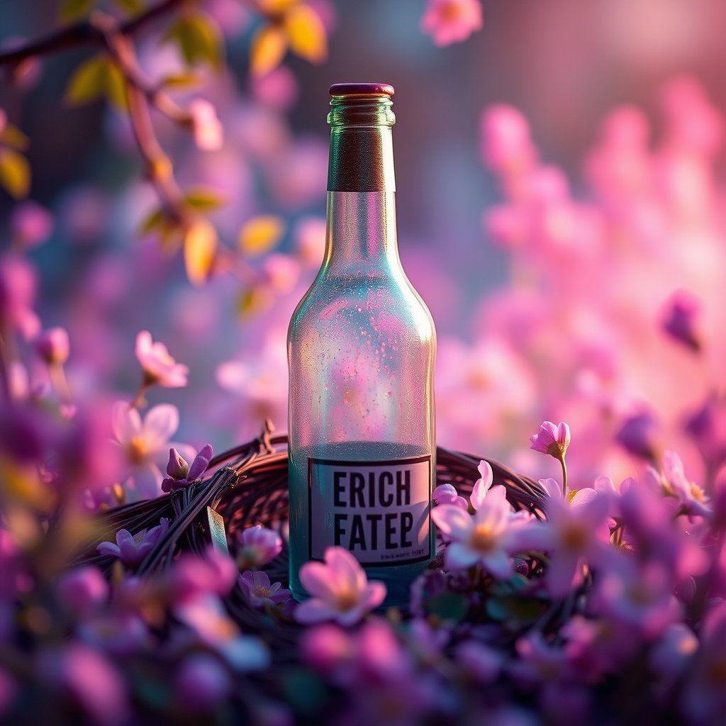 Inspire warmth and wonder in a realistic photograph captured with a Nikon D850, featuring dreamlike, colorful nature in pastel hues. Envision a full bottle nestled in this vibrant environment, refined in hyper detail and photorealism inspired by Greg Rutkowski. Utilize an f/1.6 lens for lifelike, high-res sharp focus and striking contrast. Capture intricate and detailed atmospheric light refraction with masterful lighting, echoing Unreal Engine 5's cinematic concepts. This photography masterpiece, rendered with Octane, showcases trending artistry celebrated at CGSociety, infused with an imaginative twist.