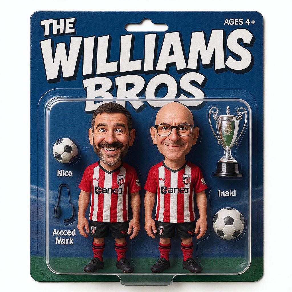 Inspired by a stylized collectible action figure toy package, the "Williams Duo" is designed for ages 4+, featuring caricatured action figures of Nico and Inaki Williams. They are outfitted in Athletic Bilbao jerseys and shorts, along with sleek black soccer boots. The package boasts fun, interchangeable accessories including a La Liga soccer ball and a shiny Copa del Rey trophy. The packaging's backdrop is a dynamic blue, accented with large, playful white text that reads "THE WILLIAMS BROS". These figures have exaggerated, humorous facial features, giving them a lively, satirical flair that adds a touch of whimsy to any collection.
