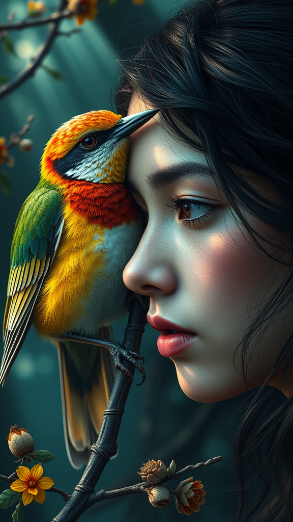 Inspired by Alphonse Mucha and Guweiz, create an intricate and detailed scene featuring a highly realistic Waxwing bird alongside a photorealistic portrait of a young woman. Highlight vivid colors and incorporate volumetric rays of light reminiscent of Kerem Beyit's style, focusing on powerful and emotive expressions. Aim for ultra-high detail and clarity in an 8k resolution, maintaining an aspect ratio of 5:7 while exploring subtle creative variations within the composition.