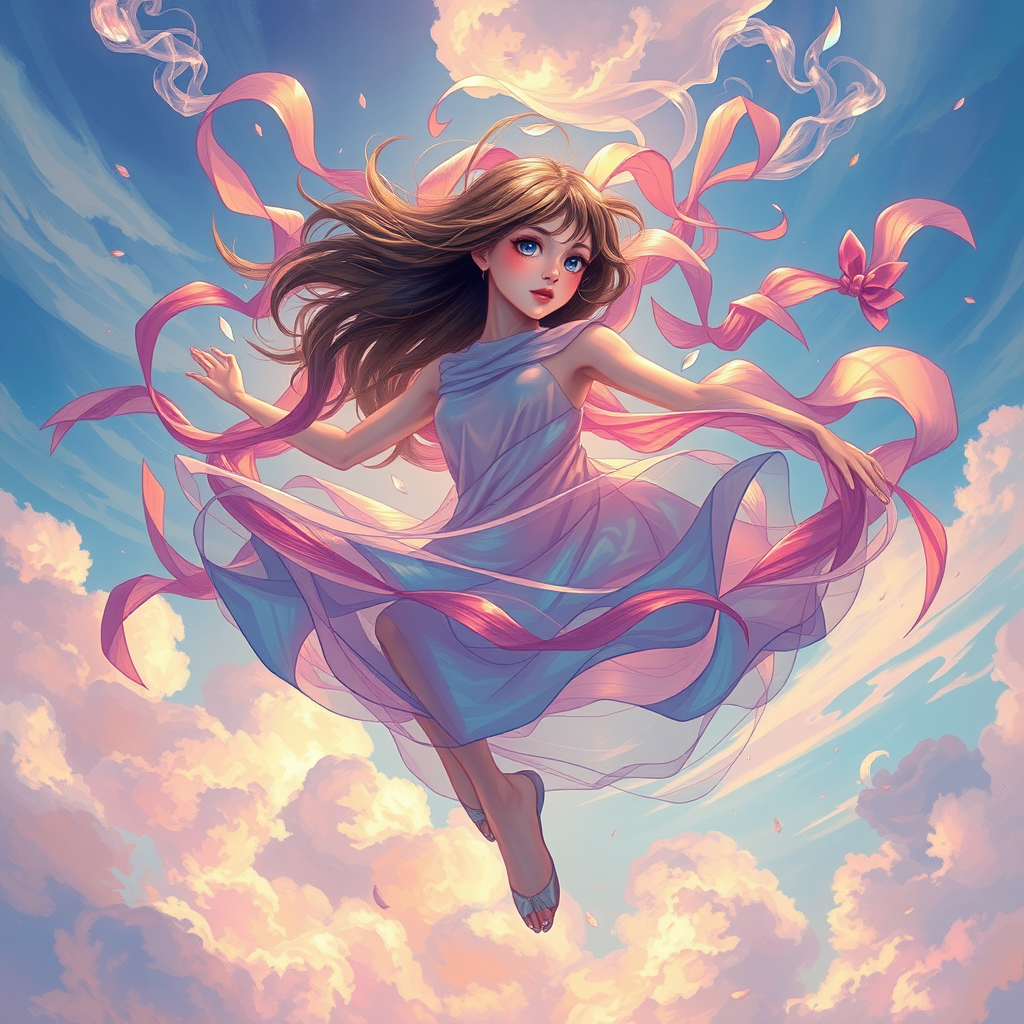 Inspired by classic artists like Loish and James Jean, envision a floating female figure made of ethereal ribbons and wisps of smoke, dancing across a vibrant sky. Her form is a kaleidoscope of mystical colors, evoking contemporary impressionism, reminiscent of Yanjun Cheng's portrait paintings with an iridescent touch. The scene is captured in a 3/4 perspective view, adorned with a cute face and seen from a low angle. The composition sweeps and circles, centered around her large, captivating crystal eyes with big irises. Imagine this in stunning UHD, HDR, 8K clarity, without any imperfections or distortions, pure and seamless in its portrayal.