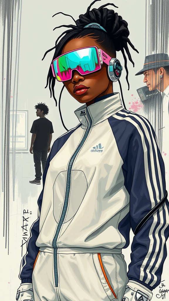 inspired by Jean Michel Basquiat, a futuristic cyborg girl exudes an eclectic mix, clad in a sleek Adidas tracksuit that embodies sporty opulence and the essence of the 80s. the imagery captures the essence of vintage photography, juxtaposing a striking black man's silhouette reminiscent of Manet's brush with a whimsical cartoon flair. the scene unfolds as a dynamic sketch, an abstract exploration where vibrant energies collide, melding technological intrigue with a retro aesthetic in a kaleidoscope of creative chaos.