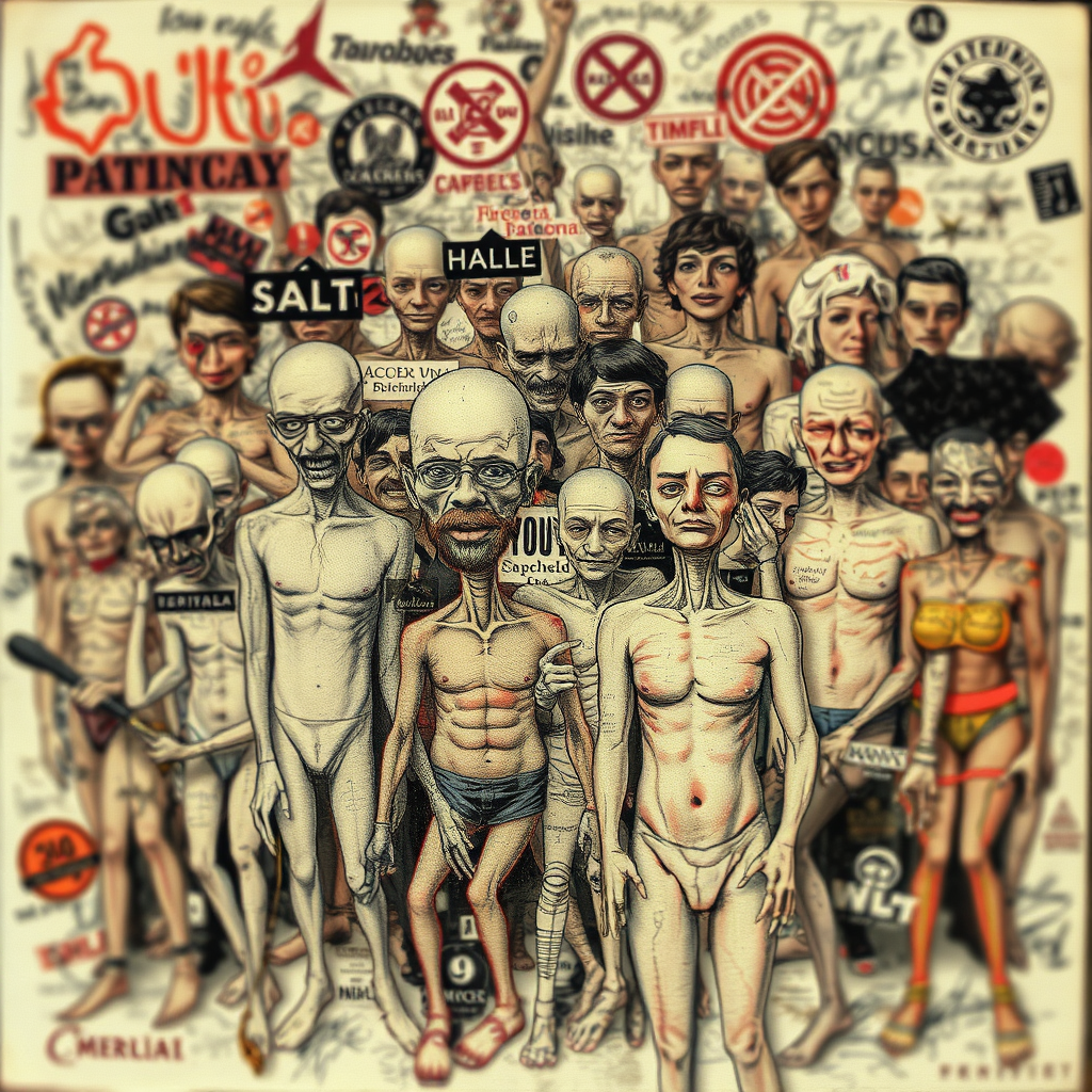 Inspired by Jorge Zaffino, this scene captures a low-quality, blurry, and grainy image with plastic textures. The composition is a chaotic amalgam of poorly drawn figures with distorted anatomy, mismatched limbs, and skewed proportions. Overlays of random text, illegible names, and faint watermarks add to the confusion, alongside scattered logos and faded autographs. The overall impression is one of the worst quality, marred by rough jpeg artifacts and elements that are cut off or appear censored. Faces and bodies are awkwardly shaped, with notable deformities, creating an unsettling visual experience.