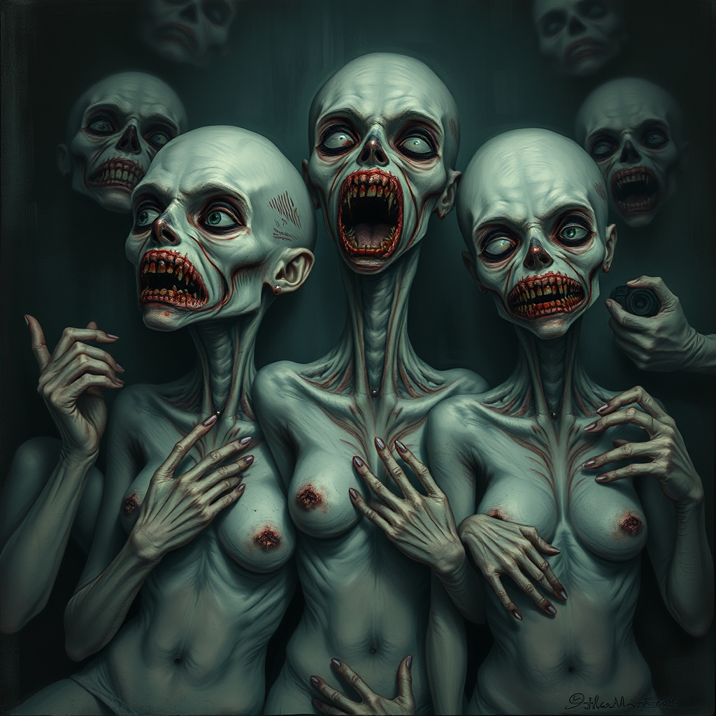 Inspired by Tanya Shatseva, this scene captures a dark and psychopathic essence, characterized by a gloomy and mad atmosphere. The image is intentionally low quality, exhibiting jpeg artifacts and an overall sense of ugliness. There are eerie duplicates that add to its morbid allure, with details like mutilated forms and poorly drawn features, including hands and faces that display mutations and deformations. The scene is blurred, presenting bad anatomy and proportions, with extra and missing limbs creating disfigured and malformed figures. Among the eerie chaos, long necks and cloned faces contribute to the uncomfortable aesthetic. Elements like cameras, names, signatures, and watermarks are subtly present, adding layers of mystery and depth. Cut-off, censored parts introduce a sense of incompleteness, reinforcing the unsettling nature of deformities, disfigured bodies, and grotesque proportions.