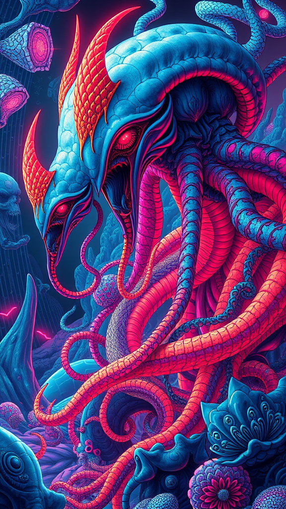 Inspired by the artistic styles of Ernst Haeckel and Maria Sibylla Merian, blended with the vibrant influences of Tristan Eaton, Victo Ngai, and Artgerm, the artwork embodies a unique fusion of sci-fi and neon aesthetics. Visually drawing from the surreal tones of Rhads, Ross Draws, and Kaethe Butcher, it integrates futuristic elements reminiscent of Hajime Sorayama and Greg Tocchini. Infused with the ethereal quality of Virgil Finlay and detailed digital craftsmanship by Ilya Kuvshinov, the scene bursts with colors and neon lights in a vivid 8K UHD HDR resolution. The depicted forms exhibit a dreamlike abstraction, featuring surreal mutations and elongated features that suggest a state of evolutionary flux. The intricate interplay of textures and colors captures a world both alien and familiar, immersing the viewer in a vivid digital landscape beyond the conventional frame of reality.