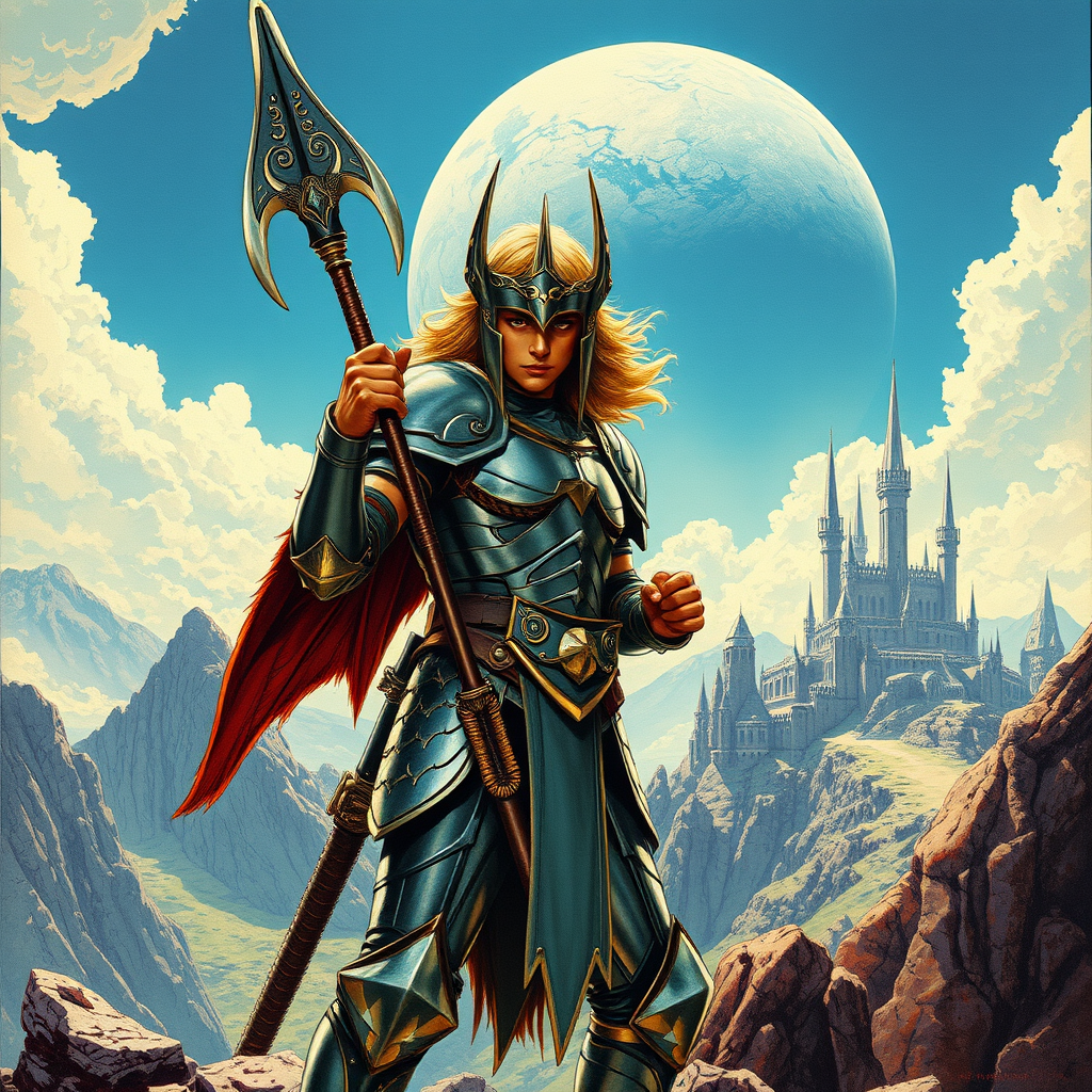 Inspired by the artistic styles of Raphael Kirchner, Moebius, and Sergio Toppi, imagine a vividly detailed portrayal of Colwyn, the gallant hero from the movie 'Krull.' Clad in his signature armor, he brandishes the legendary Glaive weapon, standing steadfast against the exotic backdrop of the alien world of Krull. The scene captures the planet’s rugged, craggy terrains and its imposing castle structures, emphasizing both the adventurous spirit and the perilous beauty of this fantastical land. Styled in a cinematic poster art format, the image features sharp, dynamic lines with a dramatic play of light and shadow, reminiscent of the high fantasy aesthetic of 1980s movie posters. Small creative twists enhance the composition, yet the core essence of Colwyn's determination and the enchanting environment remains intact, brought to life through hyperrealistic detail and a vibrant interplay of light and shadow.