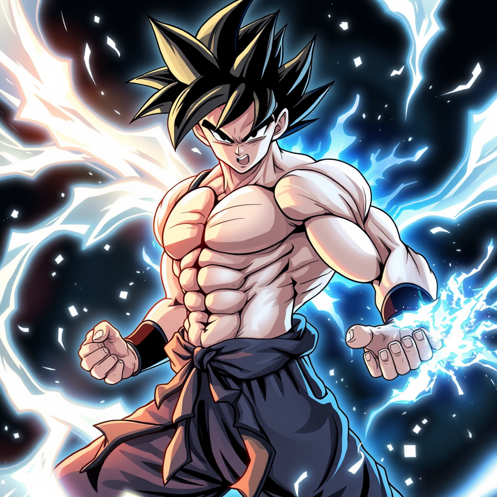 inspired by the best anime fighter from dragon ball, illustrated in the style of thiago valdi, featuring a palette of light black and silver, offering a realistic depiction of light with touches of light blue and silver, showcasing a solarizing effect, a cut and ripped physique exuding an energetic frenzy, maintaining an aspect ratio of 9:16, with intricate detail and dynamic movement