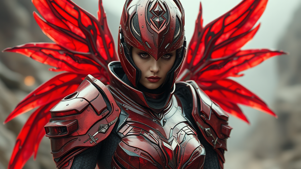 Inspired by the concept of a warrior goddess knight in a sci-fi universe, imagine a stunning celestial figure adorned in breathtaking futuristic space armor. This divine attire is decadent, intricately designed, and worn from countless battles, capturing an essence of elegance with its deep red hues. The hyperrealistic detail presents a cinematic vision that merges beauty with strength. Despite the armor's complexity, it maintains an ultra-realistic portrayal that enchants, inviting viewers to admire its intricacy. Not without its imperfections, the scene carries elements of error—a touch of chaos with missing elements, subtly rendered, suggesting a captivating blend of fantasy and reality. While the anatomy may occasionally seem off, the dedication to elegant craftsmanship persists, hinting at hints of the ethereal and otherworldly. This stunning depiction captures the imagination, a testament to the enigmatic allure of what is both familiar and otherworldly, maintaining an aura of grace amidst flaw and form.