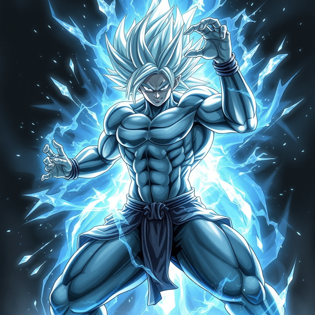 Inspired by the dynamic intensity of the best anime dragon ball fighter, imagine a character in the style of Thiago Valdi, featuring a palette of light black and silver hues with a realistic depiction of light. They exude an energetic frenzy, with their physique cut and ripped, embodying a solarizing mastery. Envision light blue and silver tones intertwined, enhancing their powerful presence.