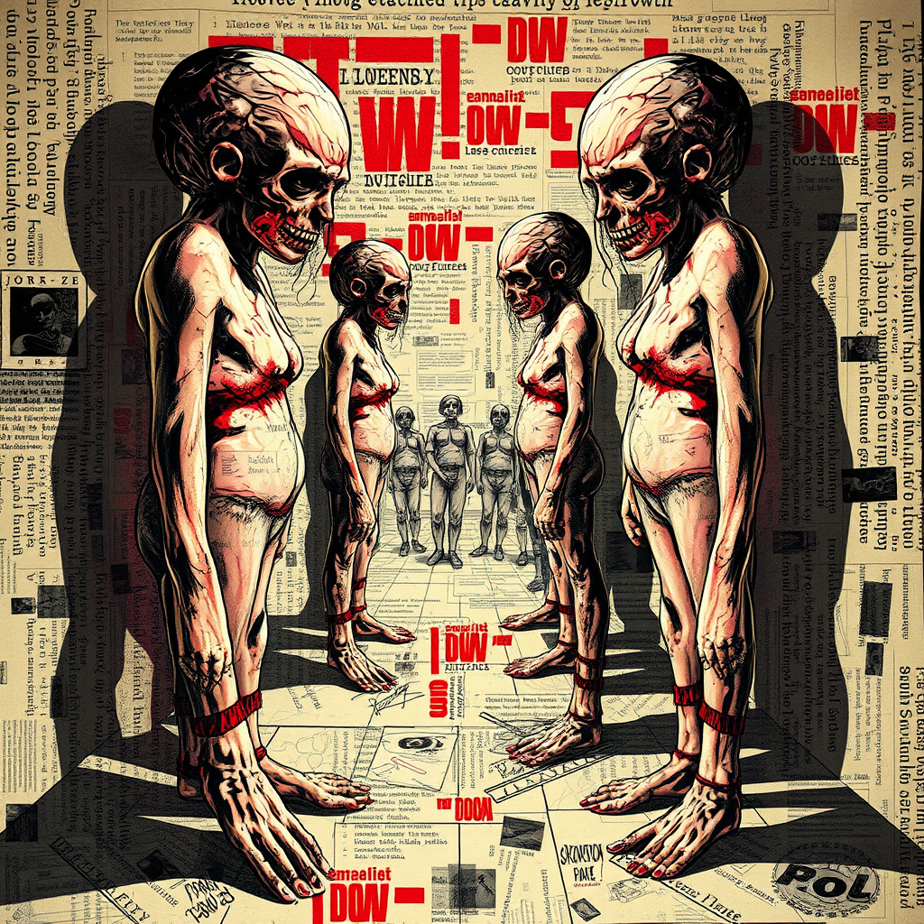 Inspired by the essence of Jorge Zaffino's style, envision an image characterized by low quality and heavily distorted elements. The scene comprises an overuse of plastic textures and prominent graininess throughout. Figures in the image seem duplicated, with poorly drawn anatomy and mismatched limbs that create unsettling proportions. The surface is marred with text overlays and multiple signatures, appearing as accidental watermarks or logos. The artwork is riddled with flaws, from the worst quality of representation to jpeg artifacts that obfuscate clarity, resulting in areas that are cut-off or censored. Faces and bodies display glaring deformities, highlighting the essence of bad anatomy and misaligned features, all encapsulated in a chaotic but evocative composition.