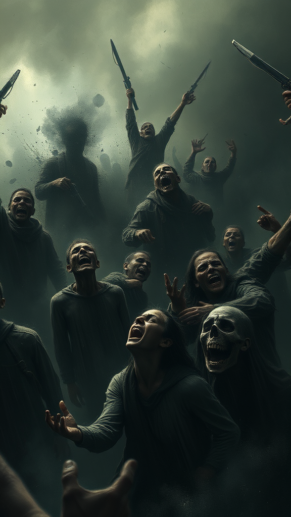 Inspired by the fearsome and haunting chaos of war, a brutal portrayal emerges, capturing the palpable terror and despair. The scene is filled with cries of agony amid a backdrop of gloomy shadows, rendered in dark, muted tones that accentuate the horror. This masterpiece in digital art style blends painting techniques with expressionist flair, creating an emotionally profound and intricate composition. With high-quality detail, the artwork leaves a lasting and haunting impression on the psyche, drawing the viewer into its dramatic and melancholic depths.