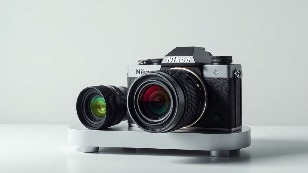 Inspired by the iconic minimalist design of Dieter Rams' Braun SK4 record player and the classic allure of Snow White, envision a Nikon Z9 camera paired with the NIKKOR Z 50mm f/1.2 S lens. Picture this setup against a smooth, transparent backdrop that highlights its bold, solid colors. Emphasize the elegant curves and sleek lines that unify modern technology with timeless simplicity, subtly reimagined with a touch of futuristic flair.