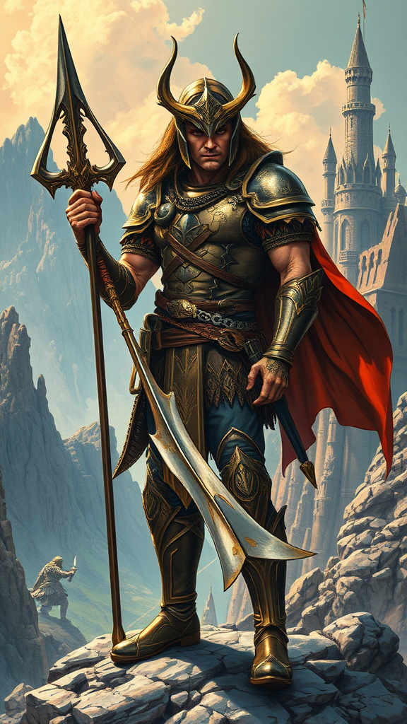 Inspired by the iconic styles of Raphael Kirchner, Moebius, and Sergio Toppi, depict Colwyn, the valiant hero from the movie 'Krull', in an intricately detailed portrayal. He stands donned in his unique, ornate armor, gripping the mystical and legendary Glaive weapon. Set against the exotic landscape of the alien world of Krull, the backdrop features rugged, craggy terrains and imposing castles. The scene brims with an adventurous spirit, capturing the hero’s unwavering determination amidst the perilous beauty of Krull. Styled in the form of a cinematic poster, the composition employs sharp, dynamic lines with a dramatic interplay of light and shadow, evoking the high fantasy style of 1980s movie posters. The image embraces hyperrealism, presenting a vibrant dance of light and shadow across the scene, adding depth and intensity while maintaining the core essence of the original inspiration.