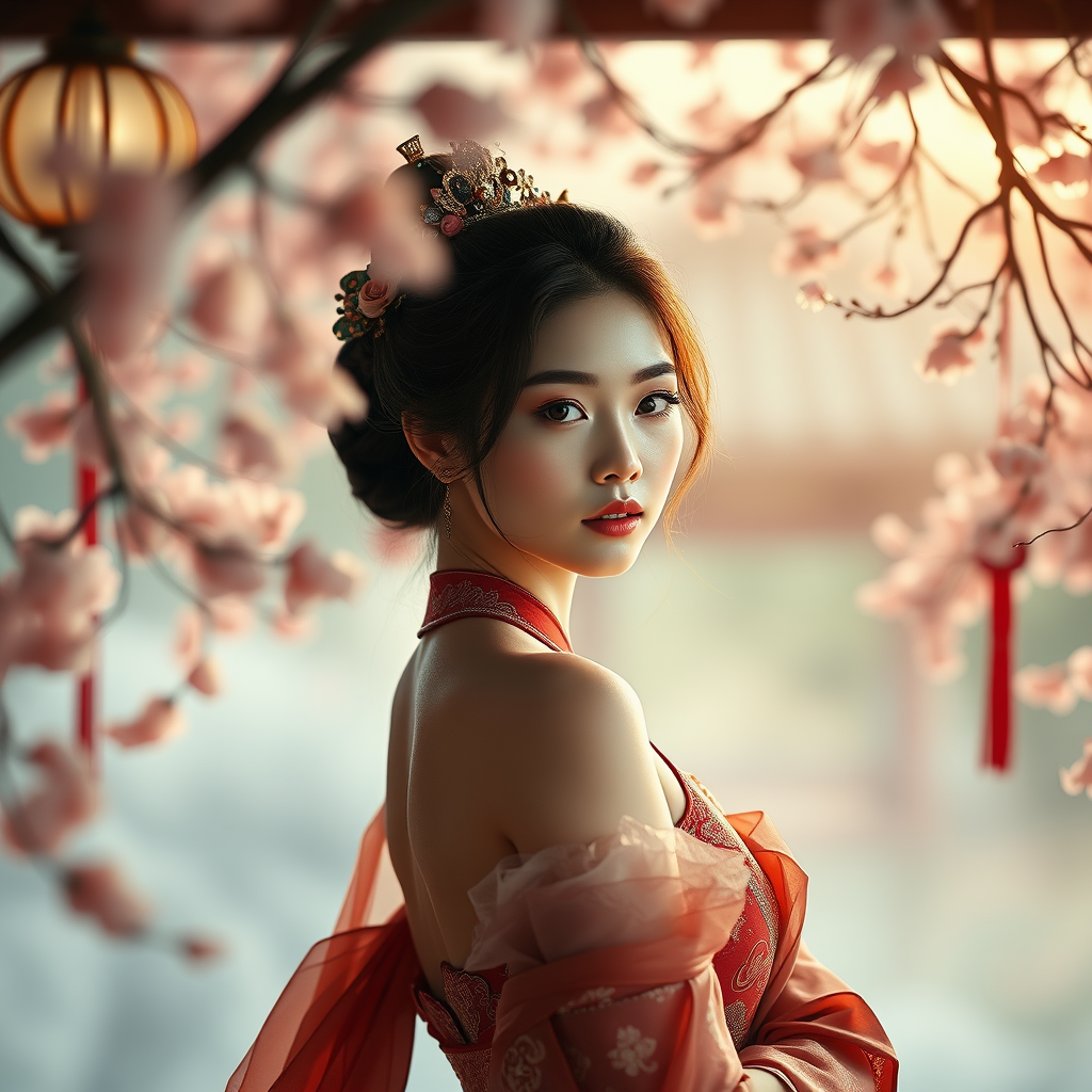 Inspired by the idea of capturing perfect anatomy in a highly detailed frame, imagine a stunning composition of a beautiful woman set in a fantastical Korean setting. The scene is brought to life in 32k UHD resolution, reminiscent of professional photography, featuring a cinematic angle that captures her elegance and grace. The depth of field adds a touch of realism, allowing her to stand out against the dreamy backdrop. This artistic vision maintains an essence of fantasy, blending traditional elements with a modern flair. While paying homage to the original concept, the focus remains on quality, elegance, and a touch of the extraordinary.