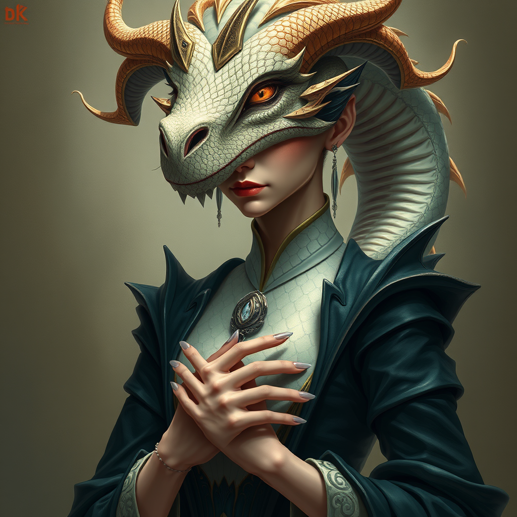Inspired by the majestic and ethereal essence of a draconian figure, envision a stylized digital portrait of a female draconian. Her features are intricately crafted with an elegant and highly detailed design, embodying the otherworldly allure and power synonymous with draconian beings. The digital painting boasts a smooth, sharp focus, reminiscent of the works by renowned artists such as Artgerm, Greg Rutkowski, and Alphonse Mucha, featured prominently in the fantasy art showcases of ArtStation. Set in an 8k resolution, this concept art captures every nuance of her unique appearance, from the delicate scales that shimmer with iridescent hues to her striking, wise eyes that convey centuries of wisdom. Her silhouette, though singular and captivating, integrates subtle asymmetries that hint at her enigmatic nature, while maintaining an overall cohesive and aesthetically pleasing composition. Her hands, though human-like, possess a refined, almost magical quality that enhances her mystical presence. Her elegance and formidable aura are conveyed through her posture and attire, which merges regal elements with draconic motifs, ensuring a harmonious balance between the mythical and the human form.