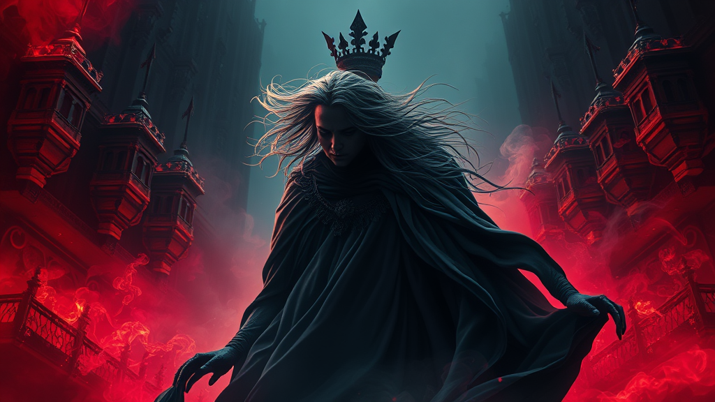 Inspired by the original concept, a portrait emerges featuring a royal figure enveloped in darkness, their long, windblown hair and flowing cloth creating an ethereal effect. Set within the vast chambers of a colossal dark castle, the scene captures the essence of Magic: The Gathering with vibrant contrasts amidst clouds of toxic fumes and spirals of ghostly smoke. The figure strikes a captivating pose, surrounded by ominous, intricate details reminiscent of Massimo Caggese's work, with references to ArtStation's dramatic shadows and orthodox symbolism. The atmosphere is ambient, imbued with emotional depth and tribal dark fantasy elements. The image is designed as wallpaper, showcasing ultra-detailed quality in a 3D render using Octane and Unreal Engine, enhanced by VFX and cinematic lighting. The composition is isometric, crafted in Blender to achieve an ultra-realistic vision in 8k resolution, with a cinematic feel within a 9:16 aspect ratio, embodying a striking balance between artistic expression and technical sophistication.