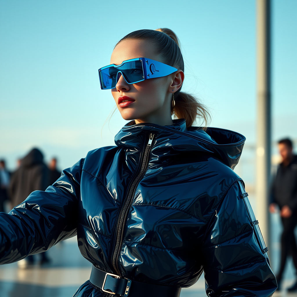 Inspired by the prompt, envision a high-fashion shoot featuring a futuristic girl styled in a Jacquemus and Moncler collaboration. She's in a striking full-body pose, wearing a dark blue reflective outfit that exudes a modern essence, complemented by translucent futuristic sunglasses. Her look blends high-tech with high-fashion, captured in hyper-realistic detail with an 8k resolution finish. The scene is crafted to capture a moment as the camera pans left, highlighting the intricate textures and sophisticated color palette of deep blues and sleek metallics, evoking a sense of advanced style.