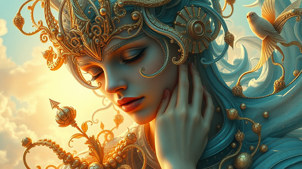 Inspired by the visionary blend of visual fiction and art, imagine the work of acclaimed visual artist Christiano V., channeling the surreal allure of Franciszek Starowieyski’s style. Envision hyper-realistic sci-fi romantic illustrations, richly layered with gold and cyan hues, where organic sculpting intertwines with the visionary techniques reminiscent of Android Jones. This romantic fantasy realm is a stunning tapestry of emotion and imagination, with whimsical elements subtly reimagined to offer fresh interpretations.