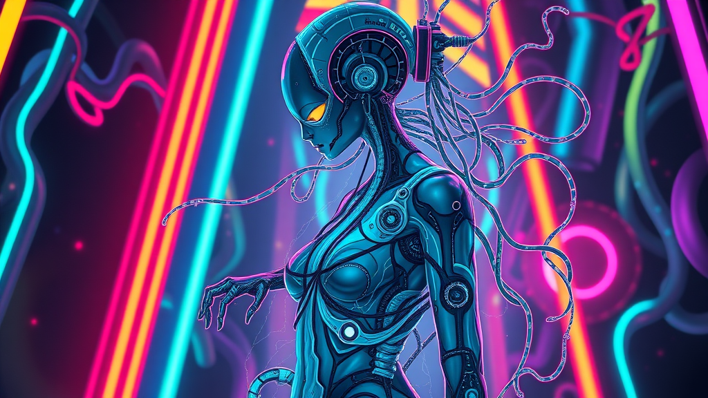 Inspired by the works of Ernst Haeckel, Maria Sibylla Merian, Tristan Eaton, Victo Ngai, Artgerm, Rhads, Ross Draws, Kaethe Butcher, Hajime Sorayama, Greg Tocchini, and Virgil Finlay, the digital painting evokes a sci-fi world illuminated by neon lights. It boasts vibrant colors with a focus on futuristic themes, seamlessly blending influences from Pixiv and the style of Ilya Kuvshinov. The artwork is rendered in 8k UHD and HDR, featuring an intricately detailed figure akin to a character from the VinteProtogenMix universe. The subject, a gracefully elongated figure, possesses an ethereal beauty with subtly exaggerated features, such as elongated limbs and elegantly extended fingers, merging organic and synthetic aesthetics. The image maintains high resolution and clarity, steering clear of visual distortions or artifacts, ensuring a stunning and immersive visual experience without distractions from watermarks, logos, or text.