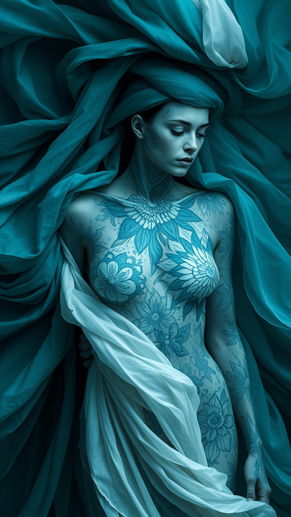 Inspired by the works of Juliane Schreiner, envision a scene of intricate underwater realms where flowing fabrics intertwine with dark turquoise and light white hues. Picture a figure adorned with elaborate body-painting that mimics the ultrafine details of oceanic life, encapsulating nature-inspired motifs. The composition highlights a harmony between human and sea, featuring textures that embody the mystique of the deep, with every fold and pattern seamlessly blending into the surrounding aquatic landscape.