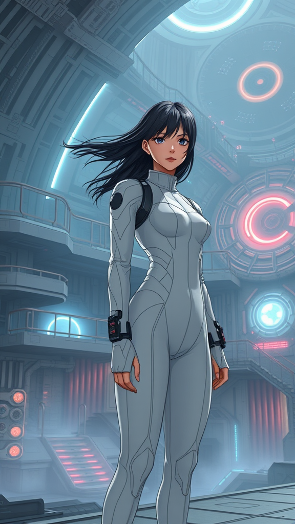 Inspired by Tsutomu Nihei, a young girl clad in a form-fitting white sci-fi jumpsuit stands amidst the intricate interiors of a futuristic spaceship. Her features are sharp, underscored by a cold expression, as her hair flutters gently in the artificially chilled air. The room is vast and multi-leveled, exuding a sense of gigantism, with muted colors and a soft blue lumen casting just enough light to highlight deliberately placed shadows. In one corner, a vibrant lumen gleams, illuminating a tableau of sharp angles and fine details that encompass the realm of cyberpunk aesthetics. A layer of complexity is added by clusters of energy pulses and sudden flashes of light, akin to distant storms. The atmosphere is steeped in an anime-inspired style, with elements of hyper-detailing, particularly in the swirling round motifs and elements. Amidst this intricate scene, themes of duality and mutation manifest subtly, where bodies meld into fluid forms, hinting at distorted realities. Features like two heads or doubled torsos challenge perceptions, suggesting an alternate form of existence. The character's expression remains lifeless, eyes clouded, as though navigating between realms. The space is adorned with circular windows offering glimpses into the limitless expanse beyond, while the setting itself remains a tapestry of surrealism—deformed yet artfully composed.