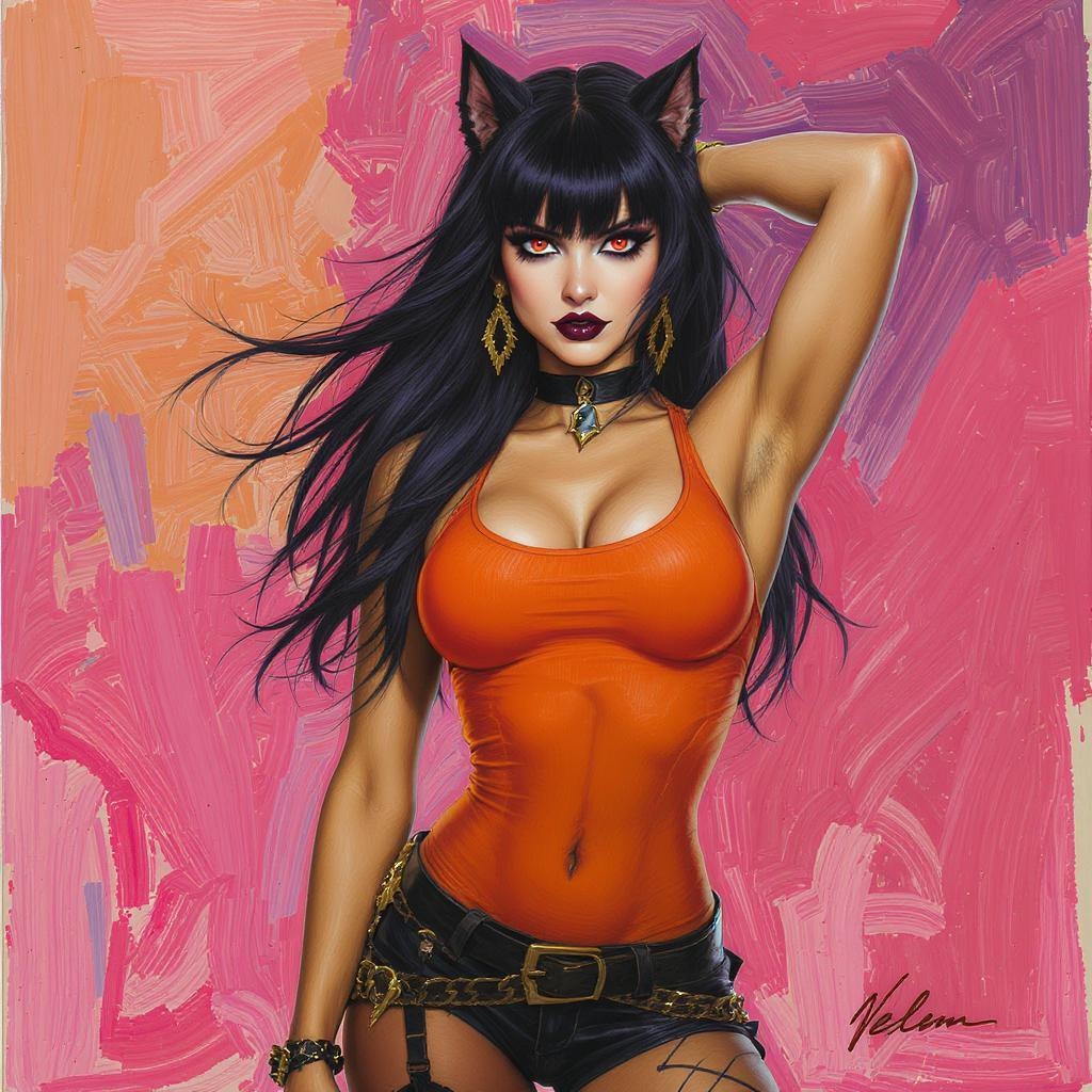 Inspired by Velma from Scooby-Doo, envision a captivating and charismatic woman with a striking athletic build adorned in an orange top. Her piercing eyes draw you in as they are accentuated by a dark, goth-inspired style. Her enchanting figure boasts interesting and dynamic shapes, while her life-size presence feels almost tangible. Crafted in the evocative and painterly style reminiscent of Jessica Drossin, this portrayal captures a harmonious blend of classic and contemporary allure.