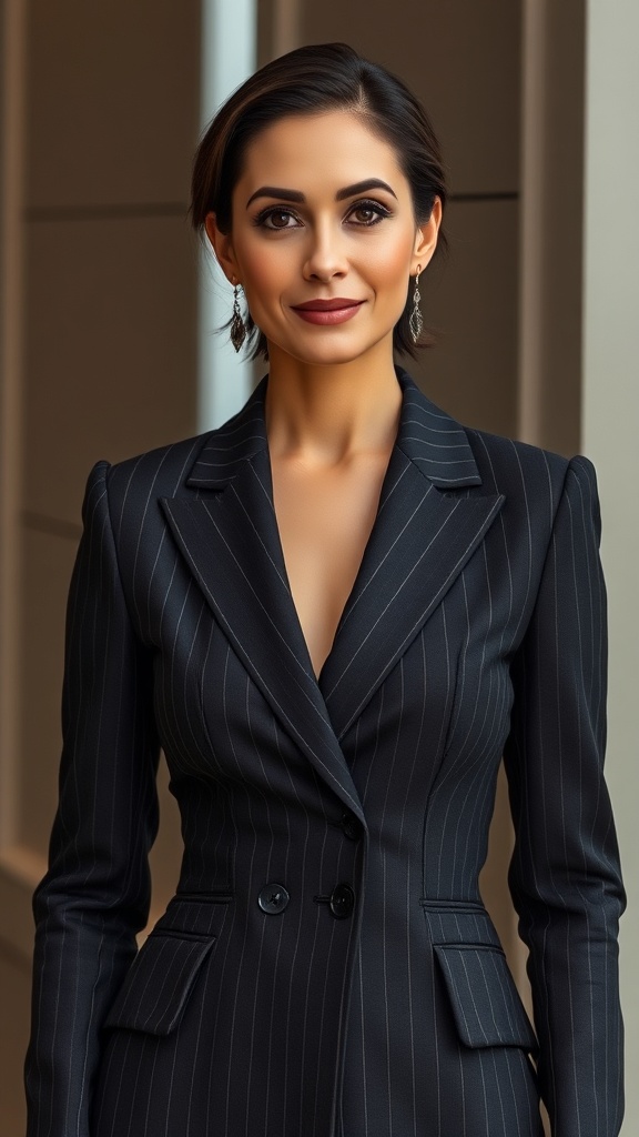 The viewer is instantly drawn to the image of an iconic female business leader, radiating beauty and strength. She is dressed in an elegant, tailored suit that highlights her figure and projects power and self-assurance. The suit is crafted from a rich blend of wool and silk, featuring a delicate pinstripe pattern that adds an air of elegance. The jacket fits impeccably, with a sleek lapel and three buttons that accentuate her slender waist. Her entire presence exudes professionalism and sophistication.