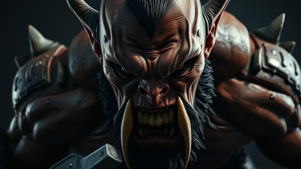 Intense character study, fierce and furious iron orc warrior, exuding menace and strength, portrayed from a dramatic low angle, evoking fear and dominance, hyper-realistic render with a glossy, smooth finish, sharply detailed and masterfully lit to enhance every muscle and contour, a striking and captivating piece capturing the essence of power and horror, trending on art platforms, in 4K, inspired by the artistic styles of Stanley Lau, Jason Chan, and Mark Hill.