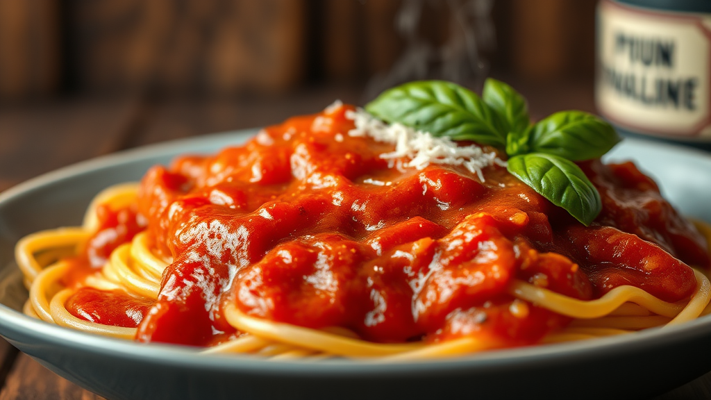 Intense close-up of a steaming plate of spaghetti drenched in rich marinara sauce, with intricate details, capturing the glossy texture and fresh basil garnish, photorealistic, inspired by gourmet food photography with a touch of artistic flair, vibrant colors contrasting against a blurred rustic wooden background, emphasizing the warmth and perfection of a culinary masterpiece.