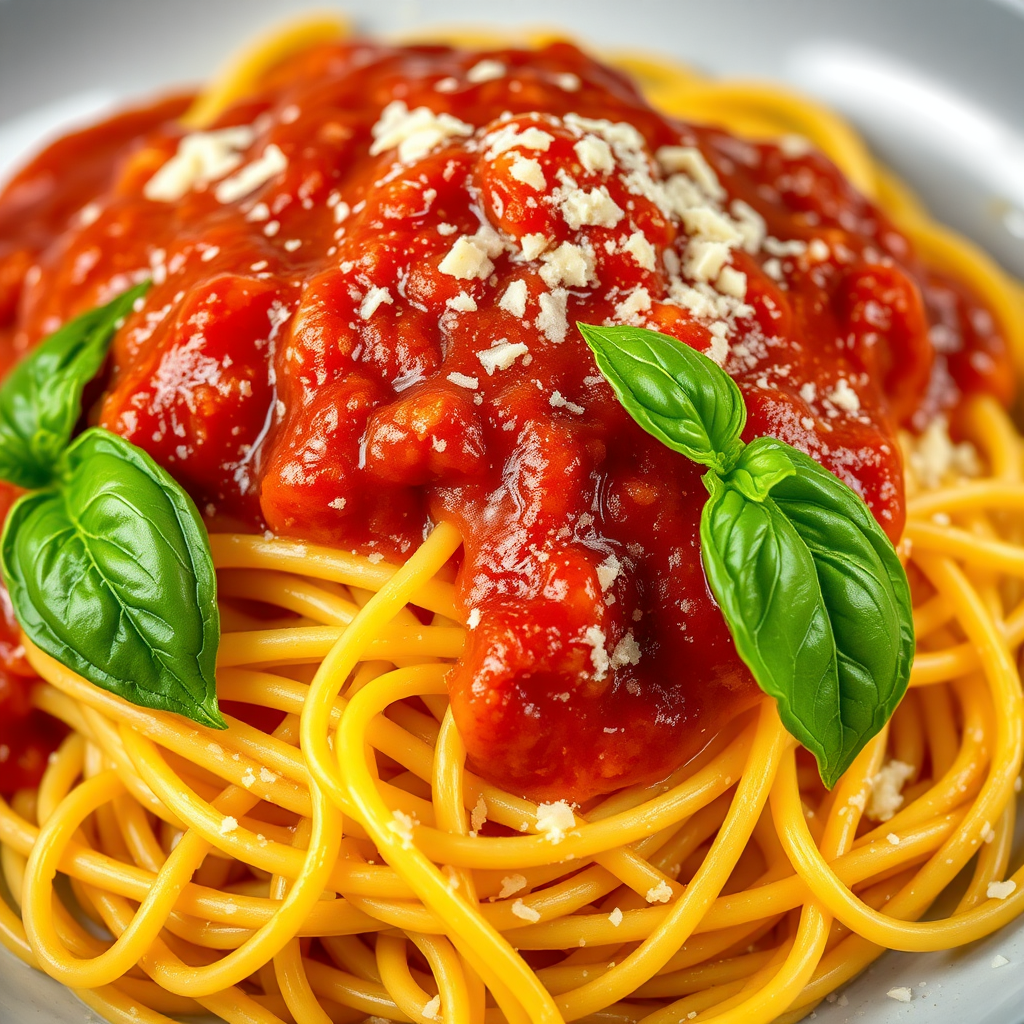 Intense close-up shot of a vibrant plate of spaghetti topped with rich marinara sauce, glistening with a hint of olive oil, garnished with fresh basil leaves and a sprinkle of grated Parmesan, captured in stunning high-quality food photography, showcasing a dynamic and slightly chaotic presentation, elongated vertical composition.