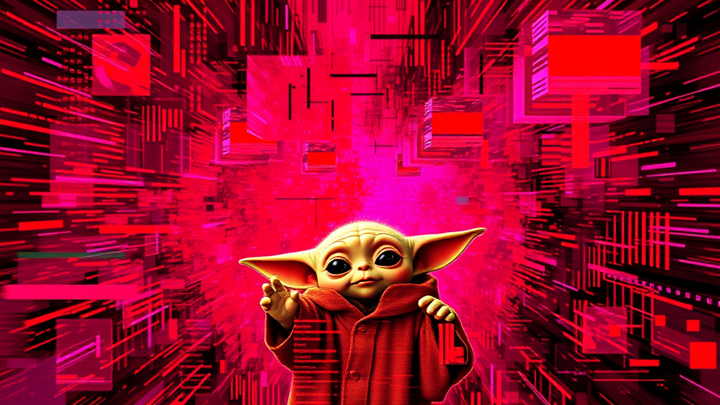 Intense digital chaos, glitch art aesthetic, vivid reds and purples, corrupted data visualization, pixelated artifacts, analog static patterns, chromatic aberration, VHS interference, digital degradation, subtle wavelight interference, and a touch of mischievous Baby Yoda.