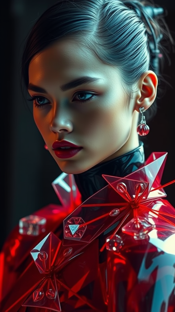 Intense female model gazing diagonally, attired in avant-garde and lavish apparel featuring glossy latex and transparent plastic materials, intricate abstract geometric forms, asymmetric cybernetic embellishments, high definition, cinematic medium shot, reminiscent of Iris van Herpen's visionary touch -- aspect ratio 3:4 -- style 750.