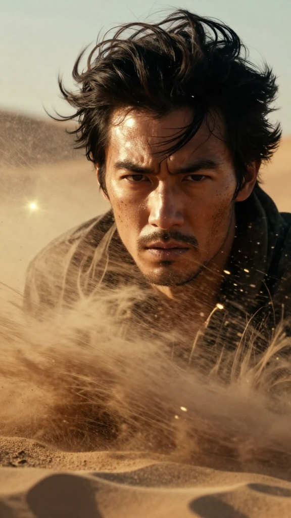 "prompt": "An intense artistic close up portrait of an adult man facing directly toward the viewer, captured in a dramatic diagonal composition. His face is partially illuminated by harsh golden desert light while swirling sand and dust spiral violently around him, frozen mid motion like sculpted waves. Sharp wind driven grains streak across the frame, catching bright highlights and creating dynamic motion lines. His expression is focused and determined, eyes narrowed against the storm as shadows carve strong contrast across his face. The background dissolves into abstract desert chaos painted with expressive brush textures and luminous haze. The composition blends photorealistic facial detail with stylized motion and dramatic lighting to evoke speed, intensity and unstoppable energy.", "style": "cinematic expressionist realism, dramatic desert lighting, dynamic motion portrait", "camera": "angle": "slightly low diagonal view", "shot": "close up", "lens": "85mm" , "colors": "palette": [ "burning desert gold", "warm sand browns", "deep shadow blacks", "bright sunlit highlights" ], "mood": "intense, energetic, relentless"