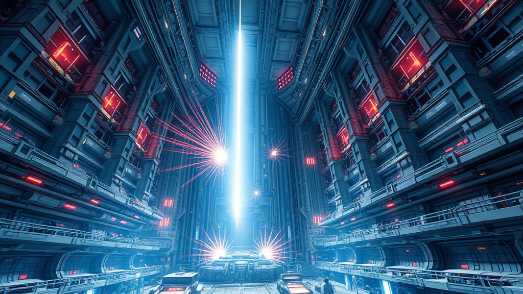 Interior of a massive spaceship, reminiscent of Tsutomu Nihei's distinctive style seen in Sidonia no Kishi, featuring towering structures and grandiose design, a colossal laser generator situated centrally, sprawling multi-level space exuding a futuristic aura, hyper-detailed sci-fi setting, a powerful beam piercing from above with energetic pulses surrounding it, bursts of acceleration and flashes of light amplifying the sensation of speed, anime-inspired illustration, drawn in ultra-high-definition 8K, embracing super-resolution for manga-like graphics, subtle creative twists maintaining the essence of grandeur and technological wonder.