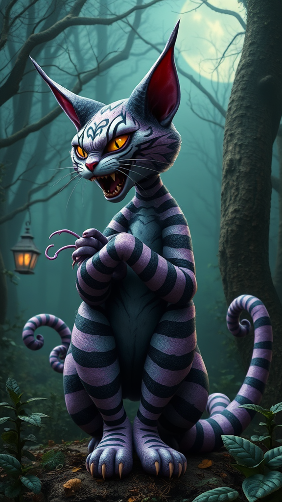 Interpretation of a fractal unholy Cheshire Cat set amidst the Alice in Wonderland forest, with a mystical, otherworldly background. The cat emits an evil laugh, depicted through villainous portraiture and embodying the essence of fractalcore. It poses dynamically, showcasing a fit, thick build, and captures the image of a gorgeously perfect Cheshire. Rendered in the style of realistic and hyper-detailed artistry, it blends elements of kawaii charm with the precision of ZBrush and hyper-realistic oil, enhanced by contoured shading for depth and dimension.