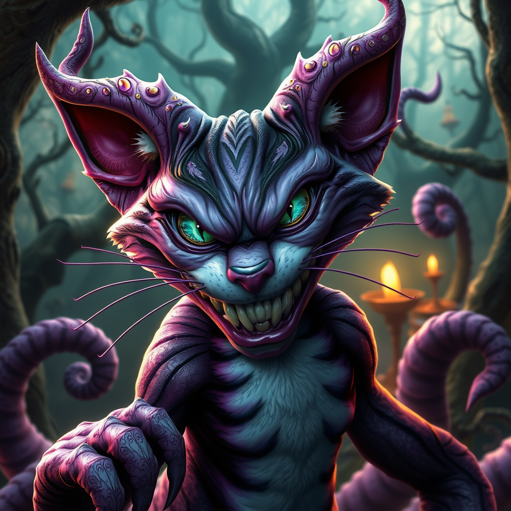 Interpretation of a fractal wicked Cheshire Cat with an enchanting grin, set in the surreal Alice in Wonderland forest, featuring a mystical and otherworldly background, with an aura of malevolence captured in a villainous portrait, fractalcore elements, in a dynamic pose, showcasing a fit and robust build. The portrayal highlights a stunningly perfect Cheshire, rendered in a realistic and hyper-detailed style with influences of kawaii aesthetics, using zbrush techniques and hyper-realistic oil painting, featuring expertly contoured shading.