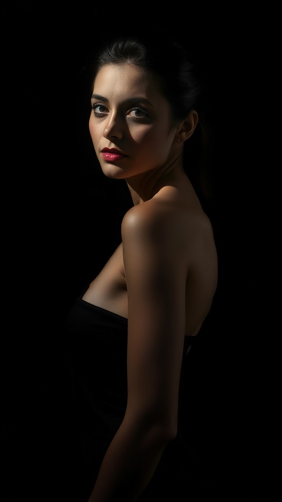 A dark, intimate fine art portrait captures a woman standing with quiet confidence against a deep, moody backdrop. The soft, directional lighting caresses her form, enhancing the gentle contrasts that emphasize the contours and textures of her skin with a painterly touch. Shadows dance across her face, partially veiling her expression, adding a layer of mystery and allure. Her pose is a blend of power and grace, radiating quiet strength and natural beauty. The composition employs rich, low-key lighting and precisely managed highlights, encapsulating a sense of hushed intensity. The background recedes into shadow, allowing her figure to emerge as the centerpiece, embodying a timeless elegance and cinematic depth. Subtle alterations breathe uniqueness into the scene, while preserving its core essence.