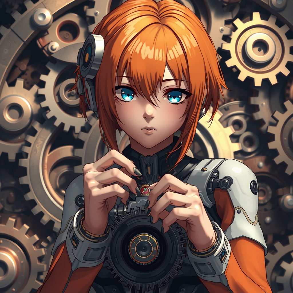 Intricate 2D illustration in anime style featuring a cybernetic girl with vibrant orange hair, expressive eyes, and a perfect face, set in a cinematic pose against a backdrop of numerous interlocking gears. The scene embodies a cybernetic biochemical steampunk aesthetic, reminiscent of Ghost in the Shell. The character carries a dynamic presence, with clockwork and robot elements integrated into her design. Soft shadows and volumetric lighting add depth to the artwork, making it highly Instagrammable and professional, centered and composed to highlight her as she works on fixing a mechanical element with precision.