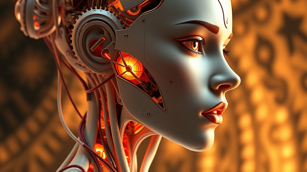 Intricate 3d render of a stunning porcelain profile female android visage, featuring cyborg elements and robotic intricacies, 150 mm scale, set in exquisite studio soft glow with accentuating rim light, showcasing vivid detailed craftsmanship, opulent cyberpunk aesthetic with delicate lace accents, hyperrealistic with visible anatomical facial muscles, interwoven cable electric wires, embedded microchip technology, elegant composition against a magnificent backdrop, rendered in octane, inspired by the enigmatic style of H. R. Giger, 8k resolution.