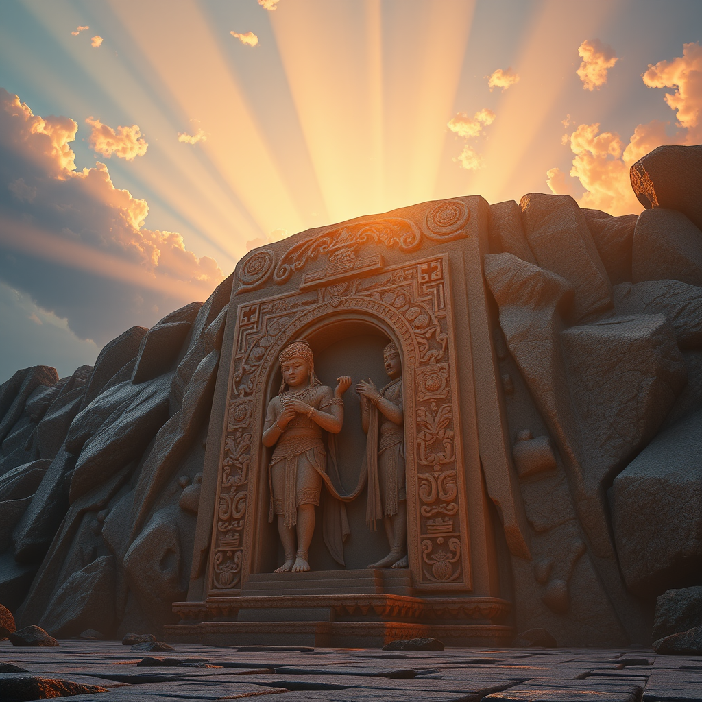 Intricate and intricately detailed, a masterpiece carved from a very old magical stone, bathed in cinematic lighting with dynamic volumetric rays and a subtle bloom effect. The scene is dramatically illuminated, set against a backdrop of majestic clouds at sunset, creating a breathtaking atmosphere. The stone's detailed carvings are captured in stunning photorealistic digital art, trending on Artstation, rendered in 8k HD for unparalleled high-definition realism and extraordinary detail.