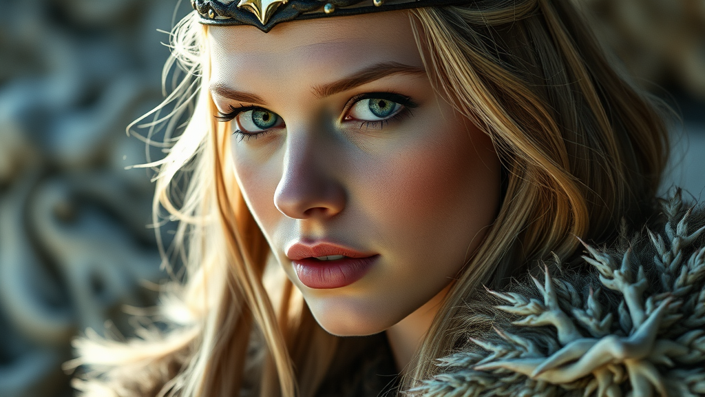 Intricate and lifelike portrait of a stunning contemporary female Viking, captured in soft natural lighting. The portrait photography utilizes an 85mm lens, creating a sense of magical realism with dramatic lighting. The image exudes photo realism with ultra-detailed features, focusing on an intimate portrait composition. Shot with Cinestill 800T film, the portrait is low-resolution, exhibiting jpeg artifacts. Despite minor imperfections like errors, missing or extra digits, some features are cropped. The artwork may contain unusual anatomy such as additional or fewer limbs or fingers, and certain elements are out of frame, creating a sense of distortion. The image features artistic quirks like tiling, giving a unique, abstract feel while maintaining an overall realistic aesthetic.