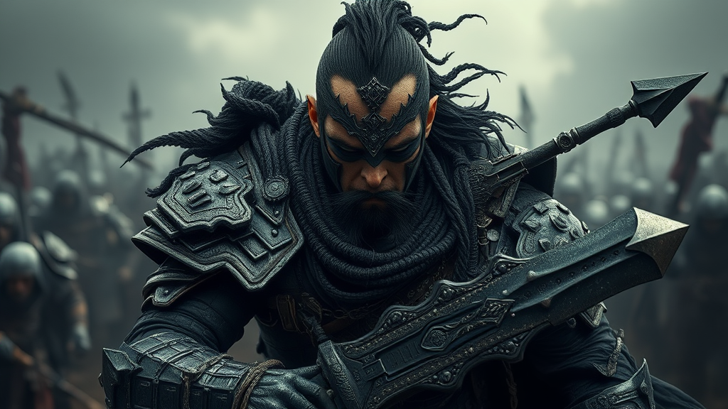 Intricate armor and weapon, dark tones palette, battlefield background, militant pose, portrait of restrained rage, power, emotional intensity, epic composition with tribal dark fantasy elements, dramatic shadows.