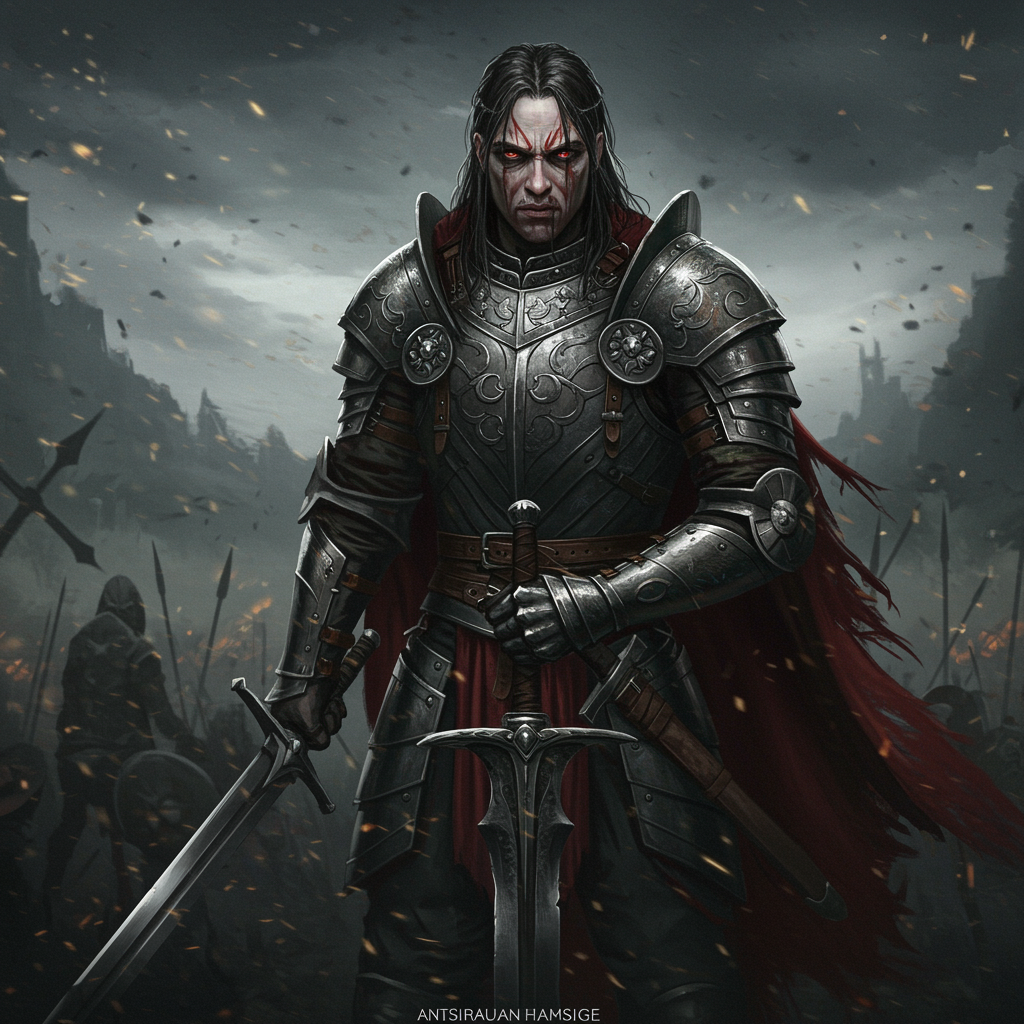 Intricate armor and weapon, dark tones palette, battlefield in background, militant pose portrait, emotional intensity, power, epic composition with tribal dark fantasy elements, dramatic shadows, showcasing resilience and determination amidst chaos and conflict, subdued expressions of inner strength and fierce determination.